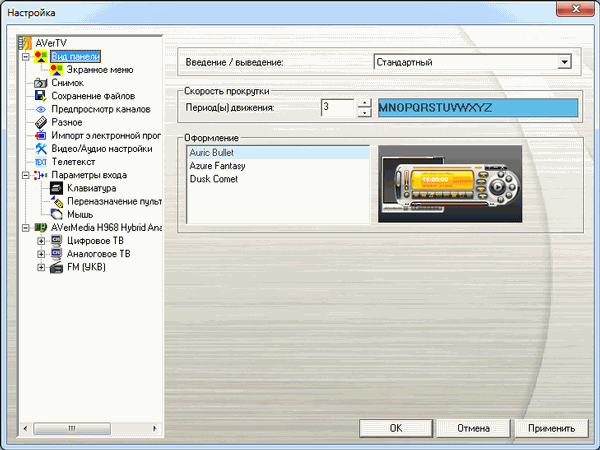 В разделе «Вид панели» находятся такие настройки интерфейса, как общее оформление (3 схемы — Azure Fantasy, Dusk Comet и Auric Bullet в версии 6.3), цветовая гамма экранного меню (OSD) и эффект прозрачности при вызове главной панели.