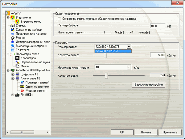 Параметры MPEG2 потока при работе в режиме отложенного просмотра (TimeShift, сдвиг по времени) у AVerTV Hybrid AirExpress, в отличие от рассмотренных ранее моделей, не допускают изменения разрешения, ограничиваясь максимальными для аналогового вещания 720×480/720×576 в зависимости от видеостандарта. Изменять видеобитрейт (от 2000 до 8000 Кбит/с), аудиобитрейт (от 192 до 384 Кбит/c) и частоты дискретизации (32, 44,1, 48 Кбит/с) по-прежнему можно. Это справедливо только для аналогового режима, в цифровом эти параметры совпадают с параметрами потока. Возможно сохранение буферного файла.
