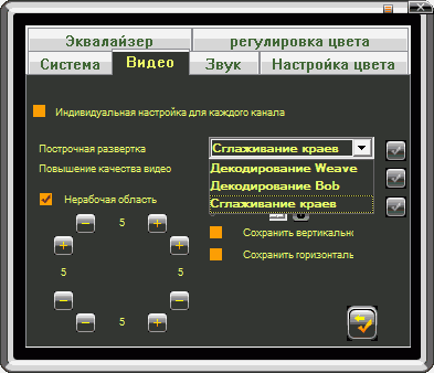 Остальные настройки, изменяемые для каждого канала индивидуально, вызываются при помощи специальной кнопки на панели интерфейса либо посредством контекстного меню. Таким образом, к стандарту цветности и режимам звука добавляются яркость, контрастность, оттенок, насыщенность, резкость, масштабирование («нерабочая область» согласно терминологии AVerMedia) с независимой настройкой по всем направлениям, тип деинтерлейсинга (Bob, Weave, краевое сглаживание) и названное в русском варианте повышением качества видео шумоподавление (включено, выключено, автоматический выбор).