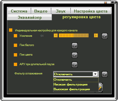 Использование декодера от NXP позволило реализовать ручное управление усилением, настройки пика белого, пика цвета, АРУ при длительной паузе и фильтра сглаживания для SECAM.