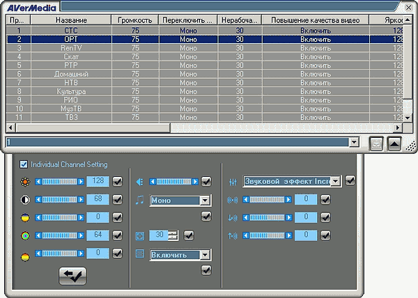 Одной из существенных недоработок, имевших место в AVerTV 6, было отсутствие индивидуальных настроек изображения для каждого канала. Что ж, теперь этот пункт можно с чистой совестью вычеркнуть из списка недостатков. К джентльменскому набору, состоящему из яркости, контрастности, оттенка, насыщенности и резкости можно добавить называемое повышением качества видео программное шумоподавление (включено/выключено/автоматически) и масштабирование. Отрадно, что видеопараметрами индивидуальные настройки не ограничиваются. Не обижен и звук, присутствуют поканальные установки громкости, формата стереозвука (в цифровом режиме отвечает за выбор звуковой дорожки), звуковой эффект Philips Incredible Mono/Incredible Stereo (описание эффектов обработки звука и примеры реализации можно найти здесь), а также тембры ВЧ и НЧ. Присутствие неподдерживаемого Philips SAA7135HL/203 режима Dolby Surround можно объяснить разве что требованиями унификации ПО. Хотя, ни одной модели на базе SAA7135HL/101 в линейке AVerMedia пока не замечено. Загадкой остаётся и загадочный ползунок Стерео, судя по значку, предназначенный либо для настройки баланса (против этой гипотезы говорит изначально нулевое положение), либо для расширения стереобазы. Затрудняет идентификацию отсутствие заметного эффекта от изменения этой настройки.