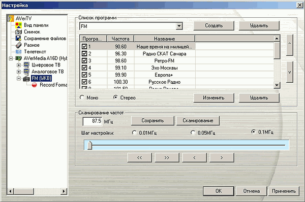 Несмотря на возможность DVB-T передавать на одной частоте как телевизионные каналы, так и радиостанции, подход AVerMedia предусматривает раздельное сканирование теле- и радиоканалов. При выборе России в качестве региона автопоиск работает корректно. Можно сохранить несколько пользовательских списков каналов.