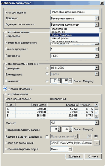 Планировщик поддерживает фоновую запись Silent Record с отключенным звуком. Существует возможность отключения компьютера/перехода в энергосберегающий режим после выполнения запланированного задания. Добавился раздел дополнительных настроек, дублирующий, в частности, такие параметры, как место хранения записи, формат и разбиение файла.
