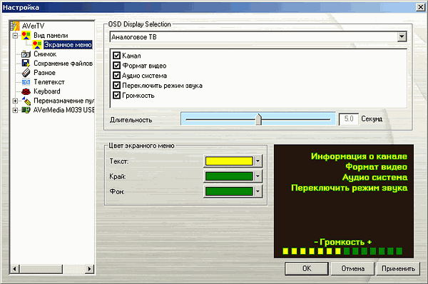 В разделе Вид панели находятся такие настройки интерфейса, как общее оформление (варианты Azure Fantasy и Dusk Comet заметно отличаются друг от друга), цветовая гамма экранного меню (OSD) и эффект прозрачности при вызове главной панели. Подраздел Экранное меню позволяет выбрать цветовую гамму, длительность и параметры для отображения (канал, систему цветности, режим звука и так далее).