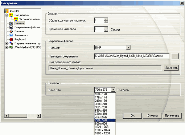 В настройках захвата кадров можно выбрать их количество, интервал между снимками, формат, префиксы (дата, время, сигнал, программа, пользовательский) и выбор разрешения (от 160×200 до 1600×1200). Максимальное количество скриншотов в серии составляет 100.