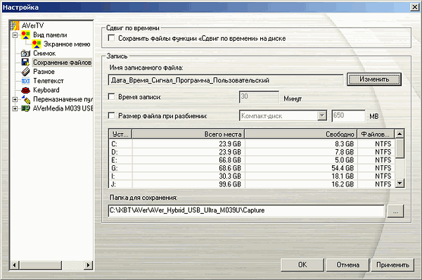 Раздел Сохранение файлов предоставляет доступ к настройкам ограничения времени записи, разбиения файлов по размеру и опции сохранения буферного файла при работе в режиме отложенного просмотра (TimeShift, Сдвиг по времени). Префиксы в названиях файлов совпадают с настройками, перечисленными выше для раздела Снимок.