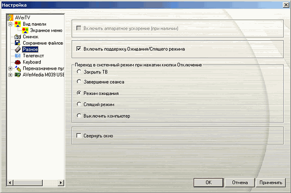 Раздел Разное содержит опцию включения/отключении аппаратного ускорения видео DxVA (почему-то недоступную уже долгое время у всех (!) тестируемых моделей на разных конфигурациях) и активацию поддержки энергосберегающих режимов с действиями, совершаемыми после отключения (выход из приложения, завершение сеанса, режим ожидания, спящий режим, отключение компьютера). Чекбокс Свернуть окно помогает при работе в FM-режиме, позволяя минимизировать интерфейс до иконки в системном трее.