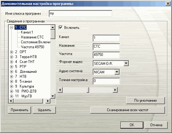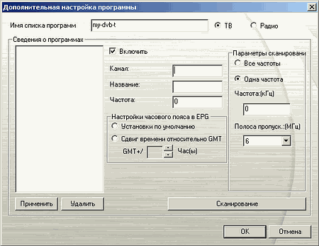 В дополнительных настройках канала можно изменить название, частоту, параметры сканирования (все частоты / произвольная частота), полосу пропускания и часовой пояс при использовании EPG (Electronic Program Guide).