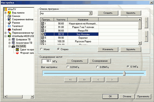 Несмотря на возможность DVB-T передавать на одной частоте как телевизионные каналы, так и радиостанции, подход AVerMedia предусматривает раздельное отображение теле- и радиоканалов как для аналогового, так и для цифрового режимов. При выборе России в качестве региона автопоиск работает корректно. Можно сохранить несколько пользовательских списков каналов.