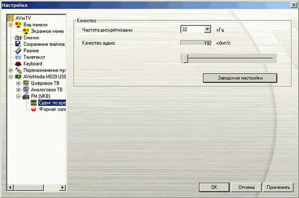 FM-режим имеет свои настройки режима отложенного просмотра, точнее, прослушивания. Как и при работе с аналоговыми телевизионными каналами используется сжатие в MPEG2 с возможностью настройки в одноимённом разделе битрейта (192 — 384 Кбит/с) и частоты дискретизации (32, 44.1, 48 кГц).
