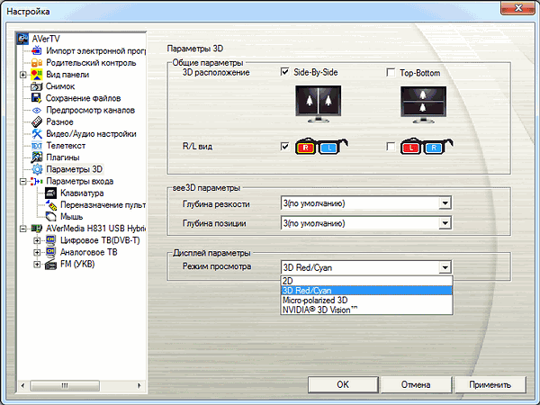 Индекс «3D», появившийся в названии AVerTV, означает поддержку стереоизображения для затворных очков Nvidia 3D Vision, поляризационных и анаглифических очков.