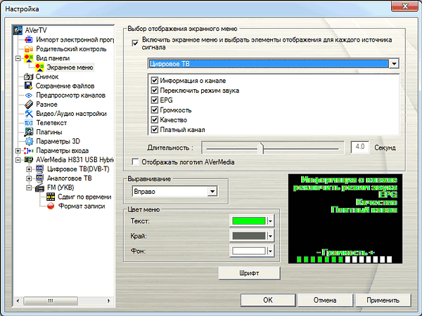Подраздел «Экранное меню» позволяет выбрать цветовую гамму, длительность отображения меню, его расположение и параметры для вывода на экран (канал, систему цветности, режим звука, информацию о телепрограмме и громкость), а также включить вывод логотипа AVerMedia.
