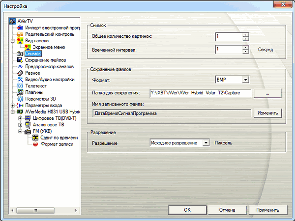 В настройках захвата кадров присутствуют количество снимков в серии, интервал между ними (от 1 до 60 секунд), формат изображения, префиксы (дата, время, сигнал, программа, пользовательский) и выбор разрешения. Максимальное количество скриншотов в серии составляет 100.