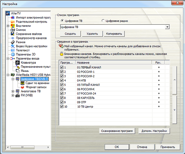 Несмотря на передачу в DVB-T и DVB-T2 на одной частоте как телевизионных каналов, так и цифровых радиостанций, подход AVerMedia предусматривает раздельное отображение теле- и радиоканалов как для аналогового, так и для цифрового режимов. При выборе России в качестве региона автопоиск работает корректно.
