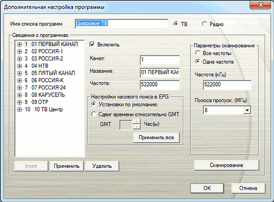 В дополнительных настройках каждого канала можно изменить название, частоту, полосу пропускания и настройки часового пояса для использования EPG (Electronic Program Guide). Там же можно провести поиск каналов на конкретной частоте.