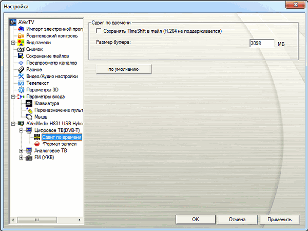 Режим отложенного просмотра TimeShift, в локализации от AVerMedia называющийся сдвигом по времени, поддерживает сохранение буферного файла в пределах заданного объема (только для MPEG2, H.264 не поддерживается).