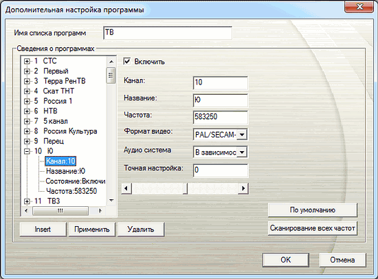 В дополнительных настройках можно найти название канала (доступное для редактирования и в общем списке), частоту, индивидуальный стандарт цветности и помещенный сюда поиск по всему диапазону частот.
