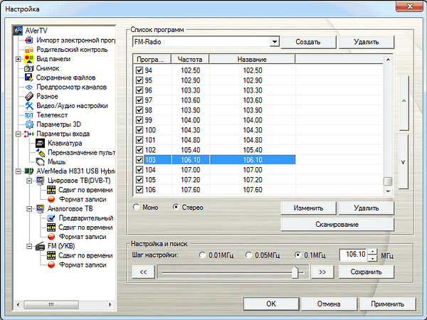 Программа использует общий интерфейс для всех режимов. В AVerTV 3D 6.5 предусмотрены готовые списки радиостанций Москвы и Санкт-Петербурга, кроме того, цифровая панель имеет два режима работы — переключение каналов и ввод частоты.