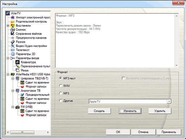 Доступна запись в MP3 (в предыдущих версиях AVerTV сжатие в MP3 поддерживалось только в Windows XP, к тому же системный кодек Microsoft, ограниченный 22 кГц 56 Кбит/с, требовал замены на полную версию Fraunhofer MPEG Layer-3 codec или использования альтернативных вариантов) в дополнение к WMA, WAV и H.264.