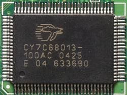 Работа с USB2.0 стала возможна при помощи контроллера CY7C68013 производства Cypress Semiconductor.