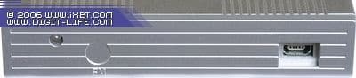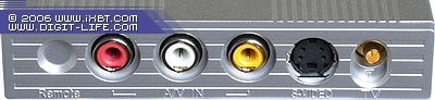 Если принять в качестве ориентира для определения «лицевой» стороны тюнера светодиодный индикатор, то вместе с ним на передней панели находится только интерфейсный разъём. Полный комплект стандартных видео- (RCA и S-Video) и аудиоразъёмов (2 RCA) размещён на противоположной стороне рядом с разъёмом для подключения антенны.