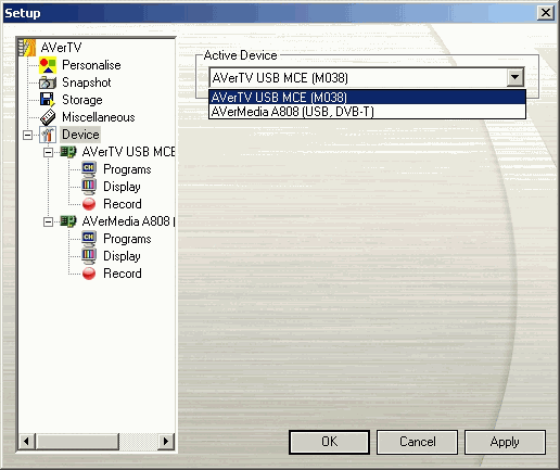 При наличии в системе других тюнеров, поддерживаемых AVerTV 6.0, программа используется для работы со всеми устройствами. Появляющийся при этом в раздел Device пункт Active Device позволяет выбрать тюнер по умолчанию.