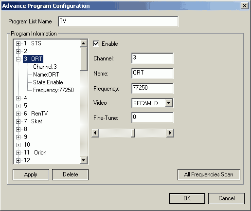 Несмотря на наличие выбора диапазона (антенный/кабельный), дополнительное меню, появляющееся после нажатия на кнопку Advance, содержит поиск по частоте. Возможна индивидуальная установка частоты и стандарта цветности для каждого канала. Озадачивает отсутствие в настройках каналов имеющихся в настройках видеовходов стандартов с поднесущими частотами звука, отличными от D/K. Впрочем, такие комбинации даже в наших непростых условиях встречаются крайне редко