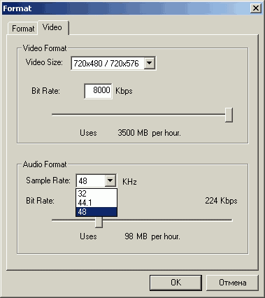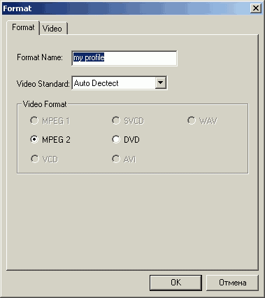 При этом минимальный видеобитрейт ограничен 5000 Кбит/с. Формат DVD отличается от MPEG2 заблокированной на 48 кГц частотой дискретизации звука. Возможно создание собственных профилей.