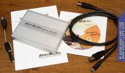 Как и AVerTV PVR 150 Plus, AVerTV USB MCE (внутреннее название M038) поставляется в белой картонной коробке. Впрочем, в будущем не исключено появление тюнера в более привычной для розничной продажи комплектации. Уже сейчас комплект поставки не столь ограничен, нежели у PCI-модели. В него входят: