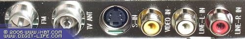 На планке тюнера по вышеописанным причинам не нашлось места для привычного разъёма ИК-датчика пульта ДУ. Там находятся антенные FM- и TV-разъёмы, S-Video, композитный видеовход и 2 RCA для подключения источников звукового сигнала.