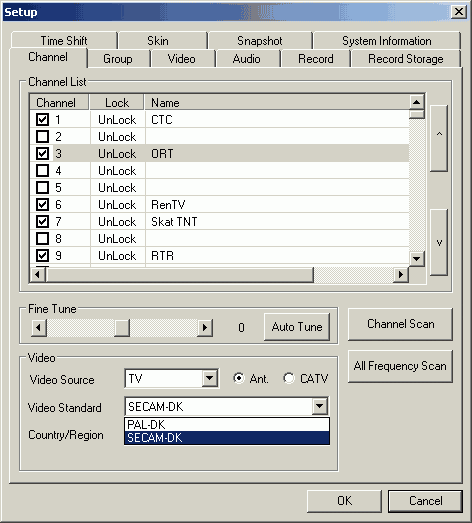 Поиск каналов возможен как по списку, так и по частоте (All Frequency Scan). России в списке стран не обнаружилось, возможной альтернативой можно считать Казахстан. Впрочем, выбор региона для успешного поиска каналов не потребовался.