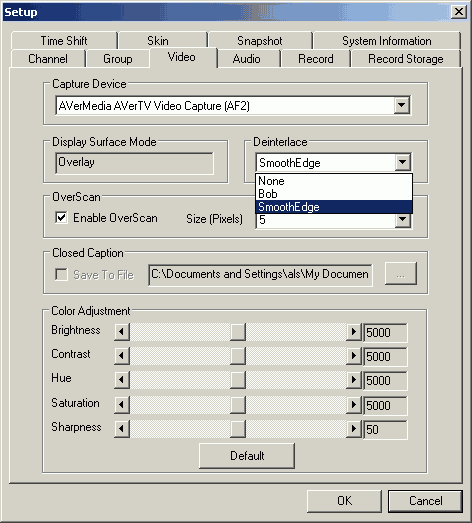 В разделе видеонастроек находятся масштабирование (OverScan) и выбор из двух алгоритмов деинтерлейсинга — Bob и SmoothEdge. Значения яркости, контраста, оттенка, насыщенности и чёткости применяются одновременно ко всем каналам.
