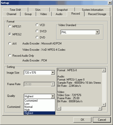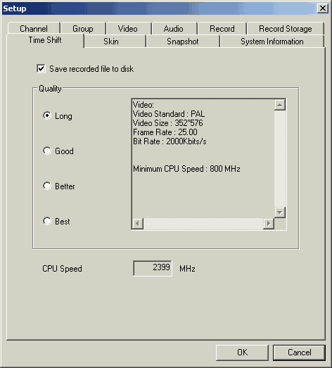 В разделе настроек режима отложенного просмотра Time Shift (используется только аппаратный кодер) можно выбрать один из четырёх профилей — Long (352×576, 2000 Кбит/с), Good (640×576, 2000 Кбит/с), Better (640×576, 5000 Кбит/с), Best (720×576, 8000 Кбит/с) и разрешить сохранение буферного файла.