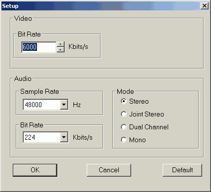 Доступны ручная установка разрешения, видео- и аудиобитрейта, режим звука (Stereo, Joint Stereo, Dual Channel, Mono) и частота дискретизации. Возможность записи с переменным битрейтом по непонятным причинам отсутствует.