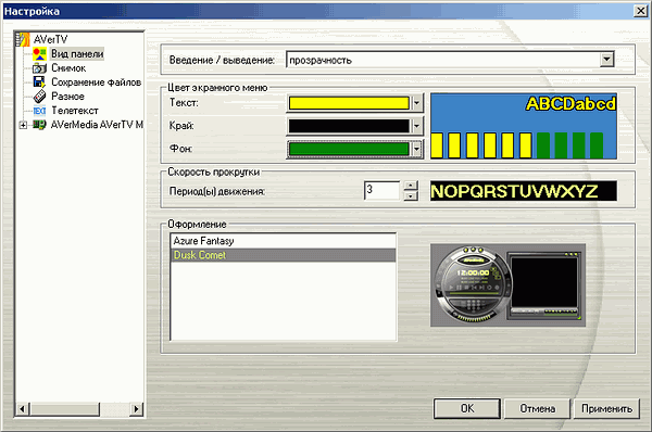 Раздел Вид панели содержит настройки интерфейса — общее оформление (варианты Azure Fantasy и Dusk Comet заметно отличаются друг от друга), цветовую гамму экранного меню (OSD) и эффект прозрачности при вызове главной панели.