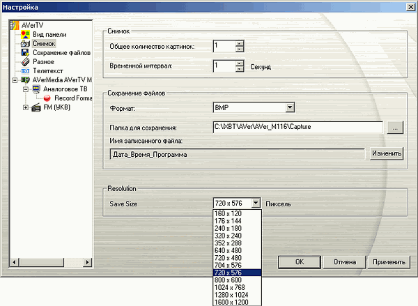 В разделе, отвечающем за захват кадров, можно найти выбор количества снимков, интервал между ними, формат, префиксы (дата, время, сигнал, программа, пользовательский) и выбор разрешения для масштабирования (от 160×120 до 1600×1200). Максимальное количество скриншотов в серии составляет 100.