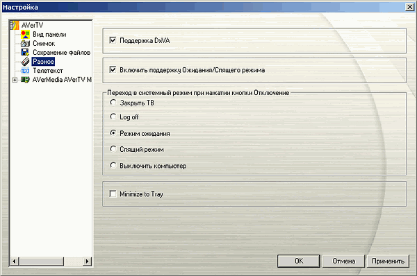 В разделе Разное находятся: опция включения/отключении аппаратного ускорения видео DxVA, активация поддержки выхода из энергосберегающих режимов для выполнения запланированных заданий и действия, совершаемые после отключения (закрыть приложение, завершить сеанс, режим ожидания, спящий режим).