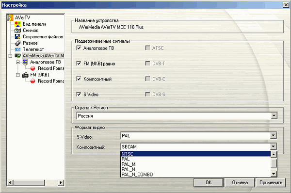 Раздел основных настроек устройства информирует о поддерживаемых источниках (аналоговое телевидение, FM-радио, композитный и S-Video входы).