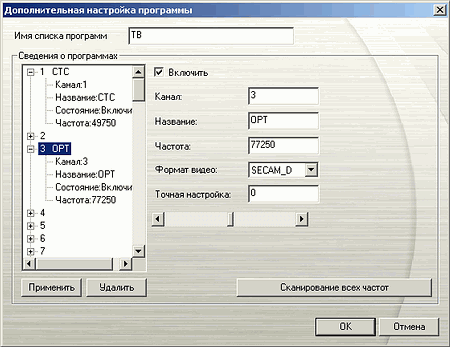 В дополнительных настройках, доступных только после сканирования, можно найти поиск по частоте, название канала (доступно в основном списке), подстройку частоты и индивидуальную установку стандарта цветности. Так же, как и у гибридной PCI модели, поиск по частоте привёл к появлению в списке множества лишних каналов по сравнению с обычным сканированием, обеспечившим отличный результат. Однако нельзя исключать возможную пользу от этой опции в других условиях приёма.