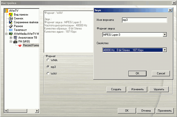 Как и в TV-режиме, возможна запись с любым установленным в системе кодеком. Запись в MP3 ограничена системными параметрами 22 кГц 56 Кбит/с. Ограничение обходится заменой стандартного кодека от Microsoft на полную версию Fraunhofer MPEG Layer-3 codec или использованием альтернативных вариантов.