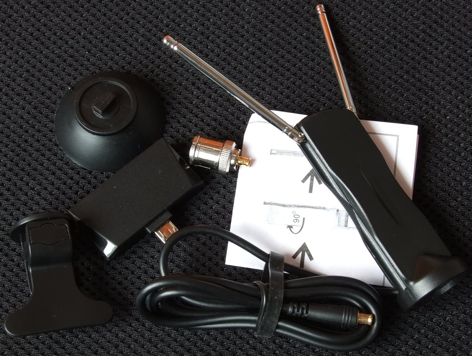- фирменная портативная дипольная телескопическая антенна для приема цифрового вещания с двумя видами крепления, прищепкой и присоской;