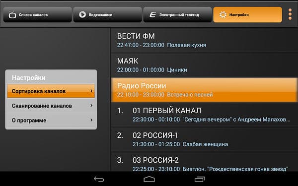 а четвертый отвечает за немногочисленные настройки, по сути, сводящиеся к сортировке каналов путем перетаскивания в списке и повторному сканированию.