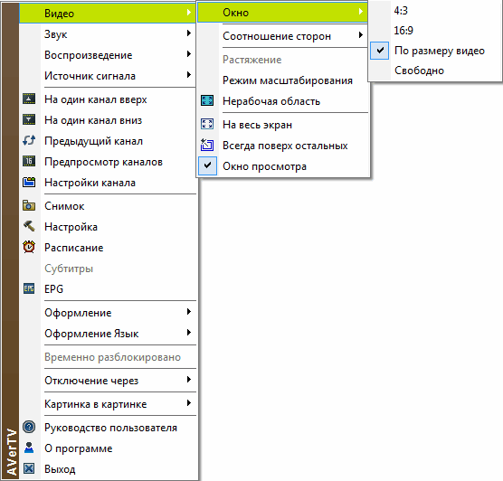Однако это не означает, что изменений не было совсем, так раздел «Видео» контекстного меню, вызываемого по правой кнопке мыши теперь содержит два подраздела — «Окно» с добавившимся к выбору между соотношениями сторон 4:3 и 16:9 и свободной настройкой пунктом подгонки окна под размер видео