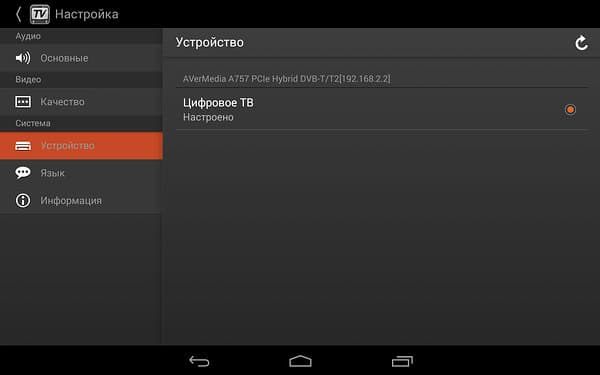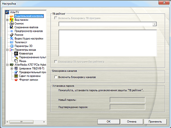 Разделы настроек отображаются динамически в зависимости от функциональности активного устройства, поэтому пунктов, отвечающих за поддержку электронной программы передач EPG (Electronic Program Guide) для аналогового вещания и за работу с подключаемыми программными модулями, при использовании цифрового TV-тюнера пользователь не обнаружит.