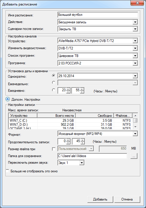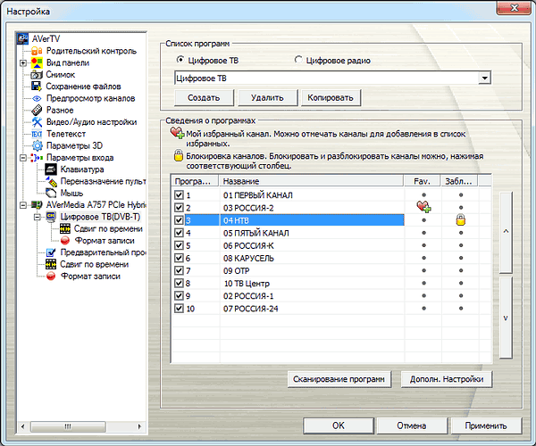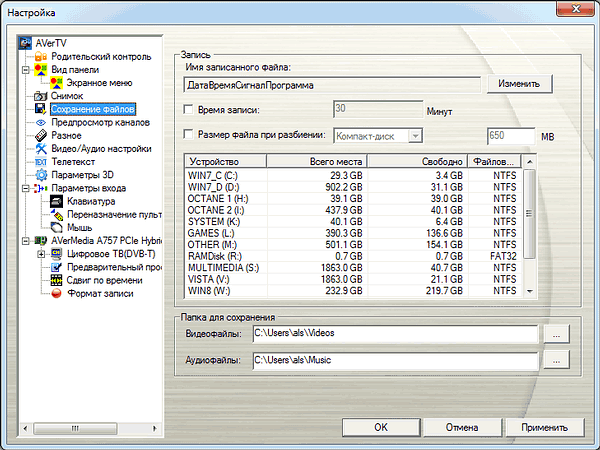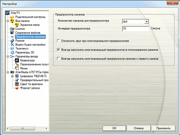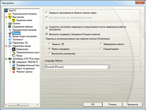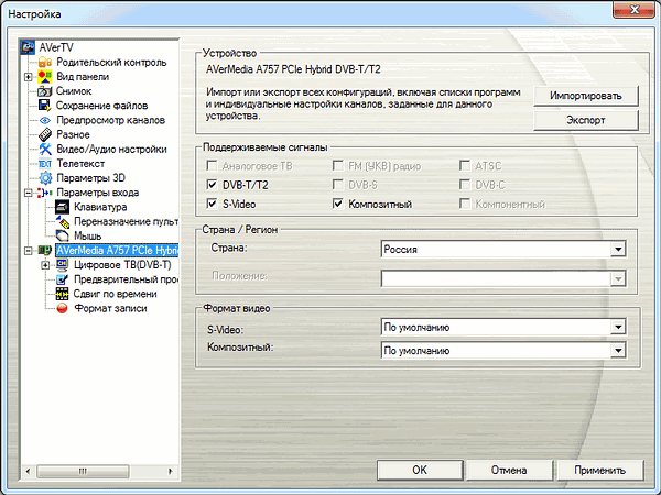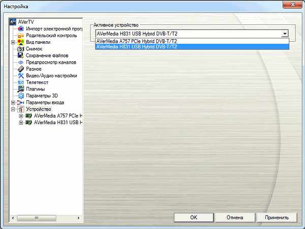 AverTV 3D поддерживает работу с несколькими установленными TV-тюнерами от AVerMedia, выбор активного осуществляется в разделе «Устройство».