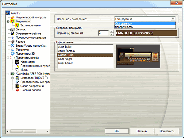 В разделе «Вид панели» находятся такие настройки интерфейса, как общее оформление (5 вариантов — Azure Fantasy, Dusk Comet, Auric Bullet, Classic Tube Dark Knight, на скриншоте выше представлена Classic Tube), цветовая гамма экранного меню (OSD) и эффект прозрачности при вызове главной панели.