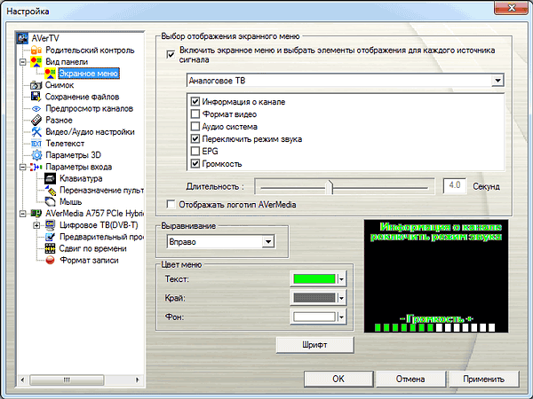 Подраздел «Экранное меню» позволяет выбрать цветовую гамму, длительность отображения меню, его расположение и параметры для вывода на экран (канал, систему цветности, режим звука, информацию о телепрограмме и громкость), а также включить вывод логотипа AVerMedia.
