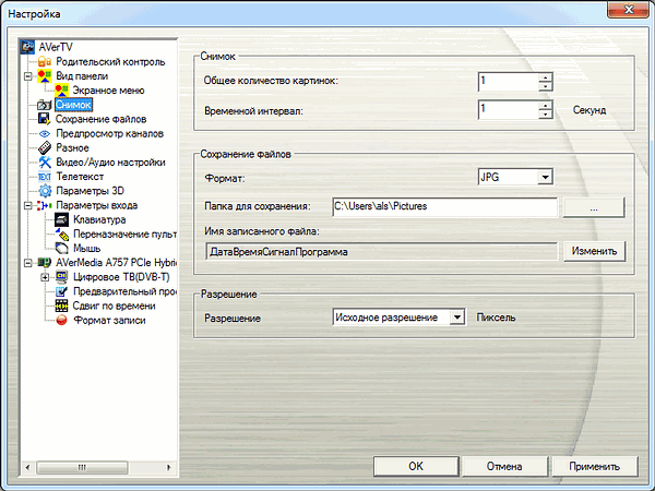 В настройках захвата кадров присутствуют количество снимков в серии, интервал между ними (от 1 до 60 секунд), формат изображения, префиксы (дата, время, сигнал, программа, пользовательский) и выбор разрешения (исходное либо от 160x120 до максимального разрешения монитора). Максимальное количество скриншотов в серии составляет 100.