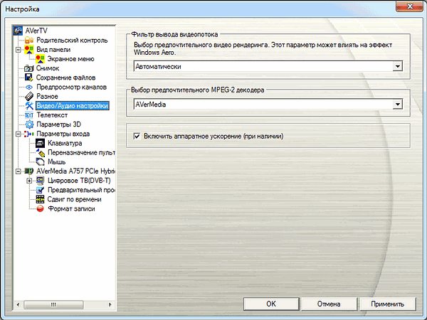 В разделе видео и аудионастроек доступны выбор видеорендерера (автоматически, Overlay Mixer, Video Mixing Renderer и Enhanced Video Renderer при доступности последнего в системе), MPEG2-декодера (собственный декодер от AVerMedia или Microsoft DTV-DVD Video Decoder) и включение аппаратного ускорения при его наличии.