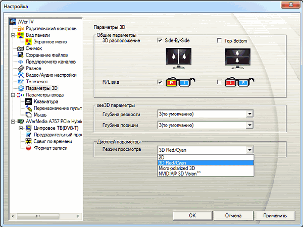 Индекс «3D» в названии AVerTV означает поддержку стереоизображения для затворных очков Nvidia 3D Vision, поляризационных и анаглифических очков.